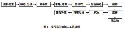 原料花生:將原料花生果首先采用剝殼機(jī)去殼; 篩選分級(jí):脫殼后的花生仁通過初清篩、分級(jí)等過程。 去雜質(zhì):挑除花生仁中的石子、碎殼、灰塵等雜質(zhì); 干燥、冷卻:將脫殼后的花生放入低溫干燥烘箱進(jìn)行 烘干,然后進(jìn)行風(fēng)冷處理;去紅衣:烘干后的花生仁迅 速進(jìn)入風(fēng)冷并去除紅衣;顏色篩選:去除黃斑、霉變、蟲蛀及未完全脫紅衣的花生;破瓣后壓榨:將脫紅衣后 的花生破瓣調(diào)節(jié)水分后送入壓榨機(jī)中進(jìn)行壓榨;原油 過濾:冷榨毛油經(jīng)過濾得到純凈的冷榨花生油;密封 冷藏:過濾后的花生油經(jīng)過密封后冷藏,待檢測(cè)。
